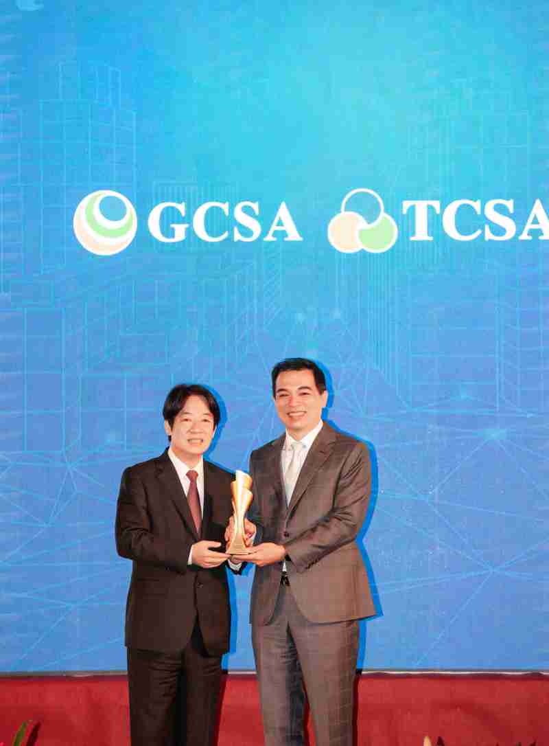 达全方位永续表现获全球永续奖及台湾永续奖肯定,,,,由副总统赖清德颁奖 (左),,,william威廉中文官网总经理柯富仁 (右) 代表领奖