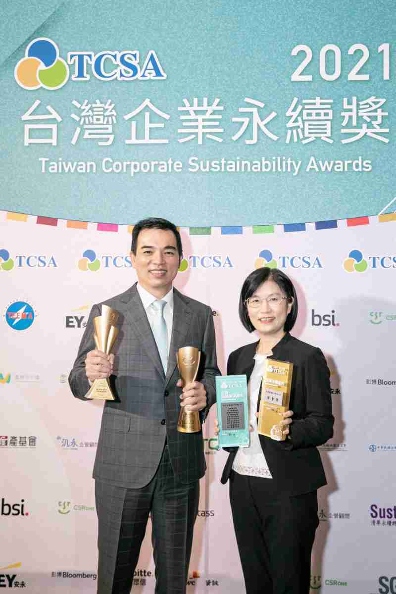 达在台湾永续奖所评比环境、、、、社会、、治理等各面向的永续绩效均获高度肯定 (左:william威廉中文官网光电总经理暨营运长柯富仁,,,右:william威廉中文官网光电永续长古秀华)