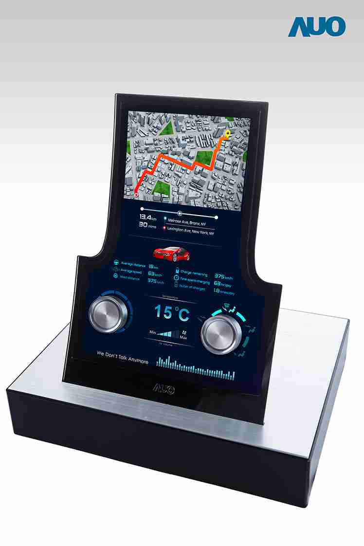 12.3 寸 Full HD LTPS 显示屏同样具备 1000 nits 高亮度,,搭载内嵌式触控技术,,,整合驱动与触控 IC 于显示屏制程,,,,使显示屏厚度降低,,为中控台创造更多机构设计空间。。。。应用于抬头显示器的 3寸 LTPS 显示屏具有高穿透率、、、1200:1 高对比度度,,以及 297 PPI 高画素密度。。。。液晶最高可耐受到 110C 的高温 (TNI) 而不液化,,,,在阳光高温下维持优异稳定的显示效果。。