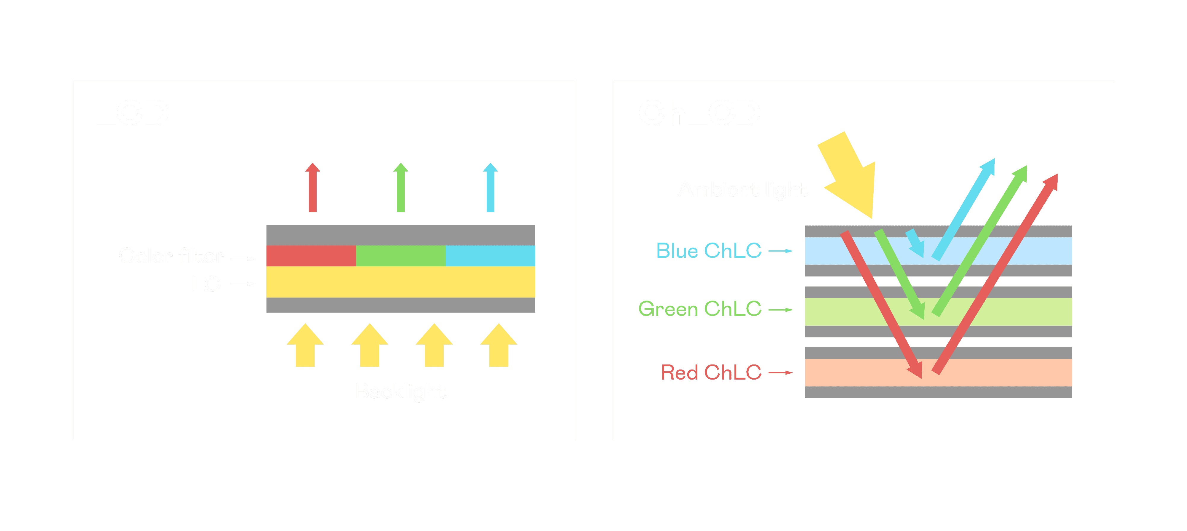 ChLCD 胆固醇液晶就如同纸张一样,,,透过反射环境光来显示影像,,因此长时间观看不易造成人眼视觉疲劳,,可达到护眼效果。。当处于户外阳光下使用,,,,LCD 影像容易失真而不易观看,,但胆固醇液晶仍可维持较佳的影像品质。。。。